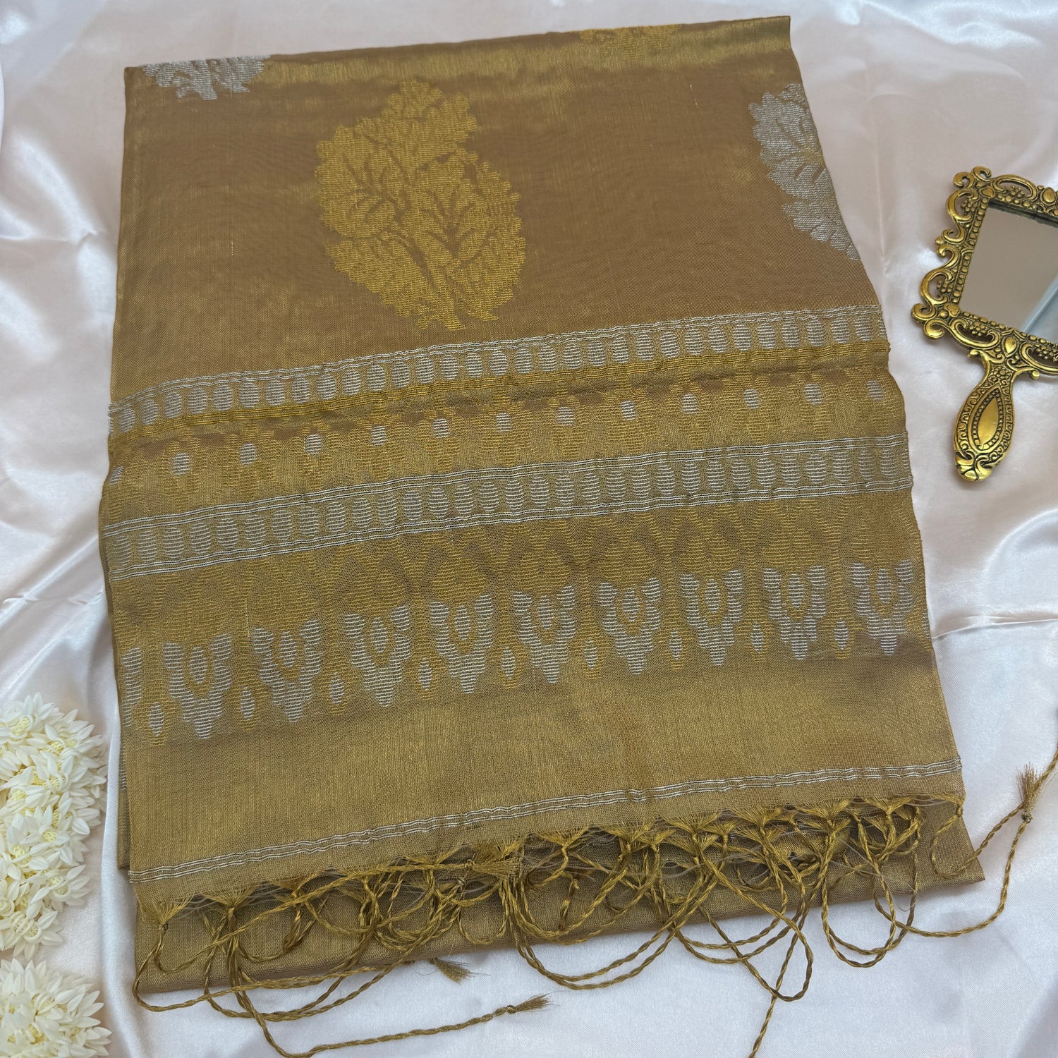 Olive Green Mul Cotton Saree with Floral Embroidery