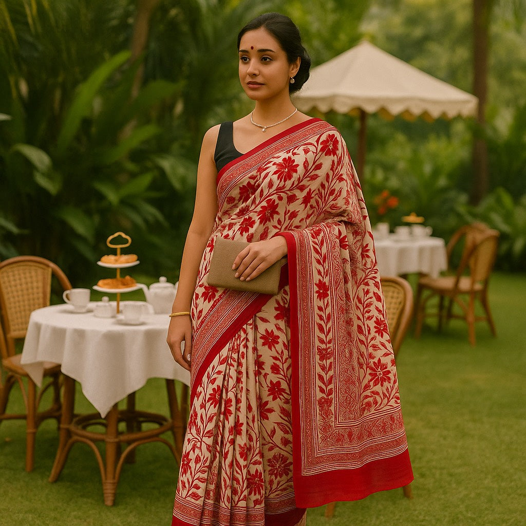 Vrinda: White & Red BLock Print Tussar Silk Saree