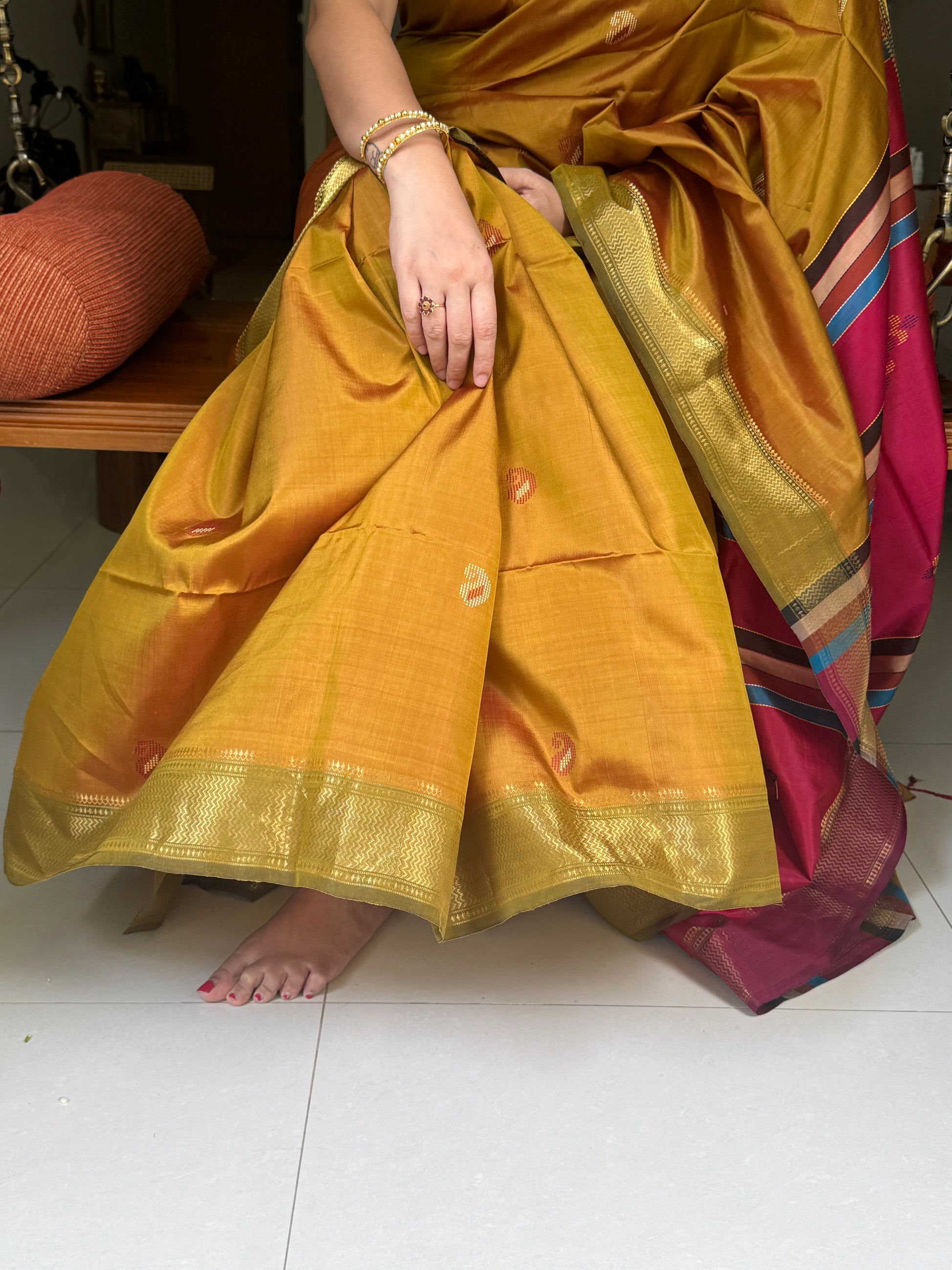 The rich mustard yellow body glows with a soft silk sheen, while the contrasting pink pallu adds drama through elegant stripes and delicate woven motifs.