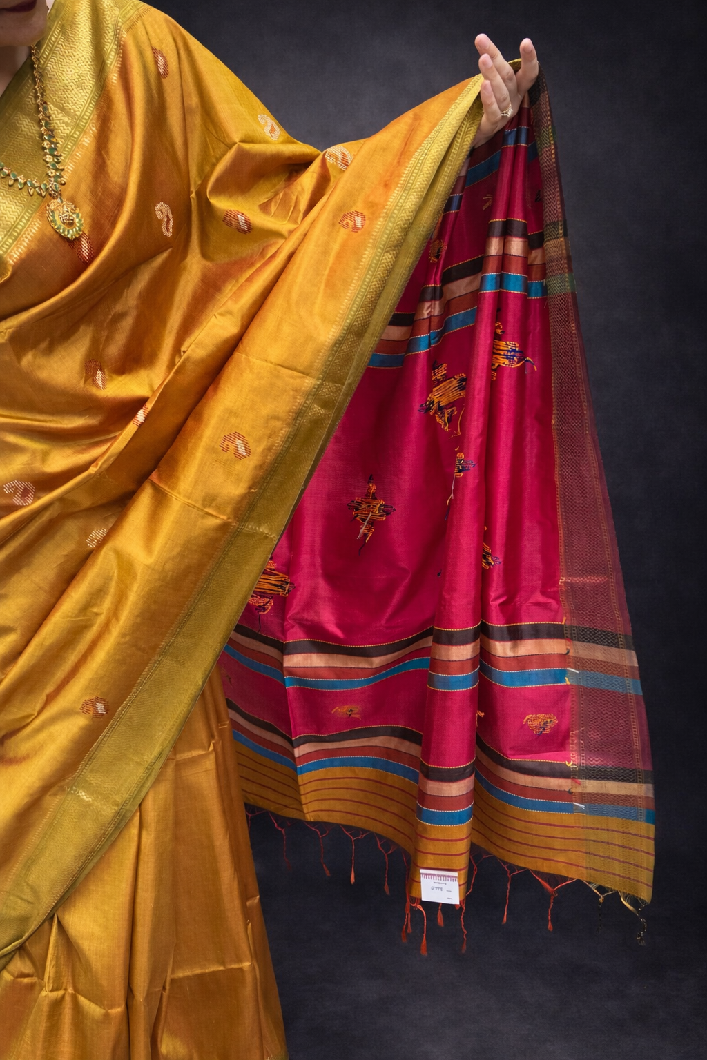 This saree is Silkmark-certified. Silkmark certification means this saree carries the Silkmark label. It is pure silk. The silk has been laboratory tested.