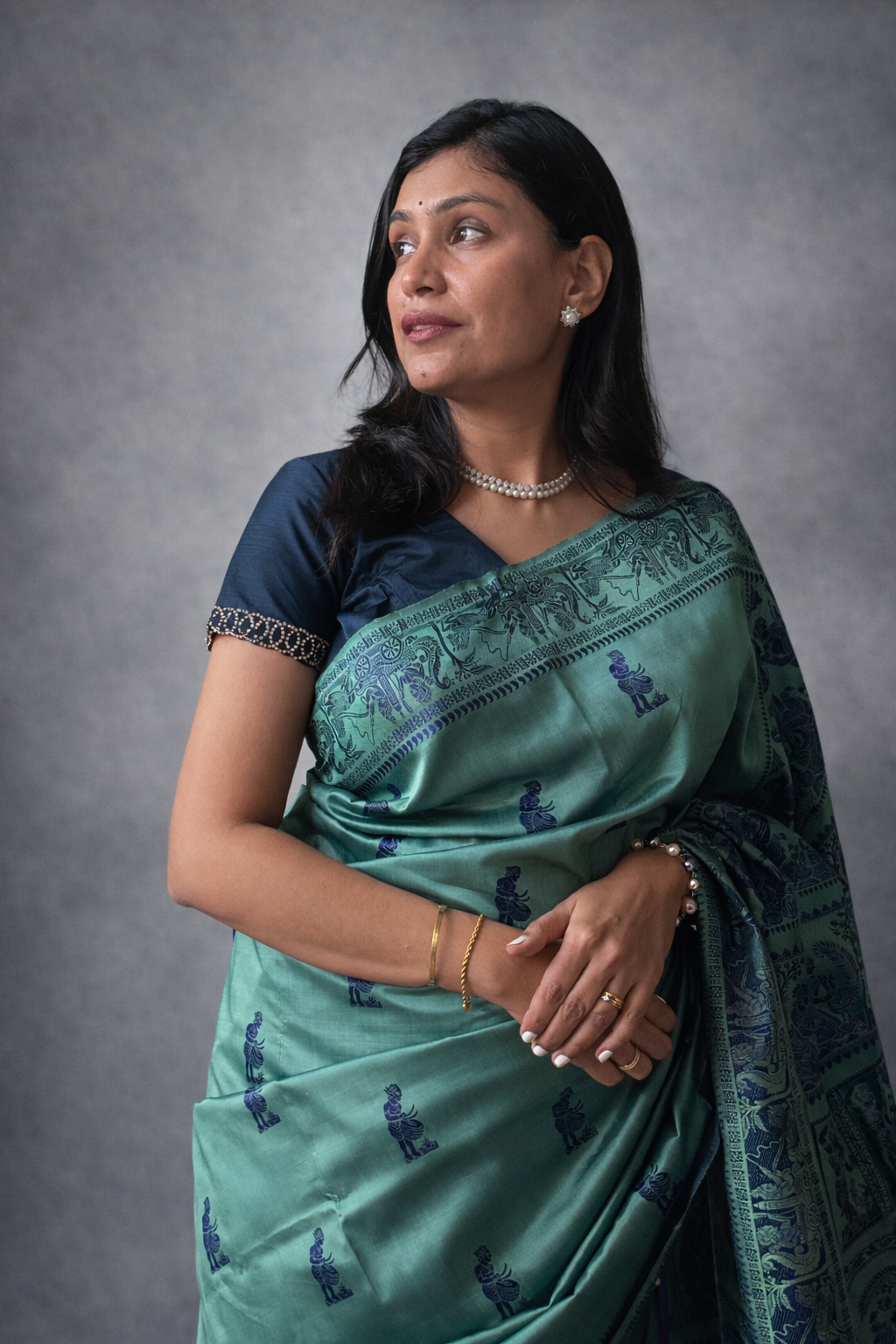 Amrita is a refined green Baluchari silk saree, handwoven by skilled artisans of Bishnupur, Bengal—the historic town where the Baluchari tradition was revived and continues to flourish. The rich green base is in pure katan silk and is adorned with deep navy blue motifs, creating a striking yet balanced contrast that feels both classic and contemporary.