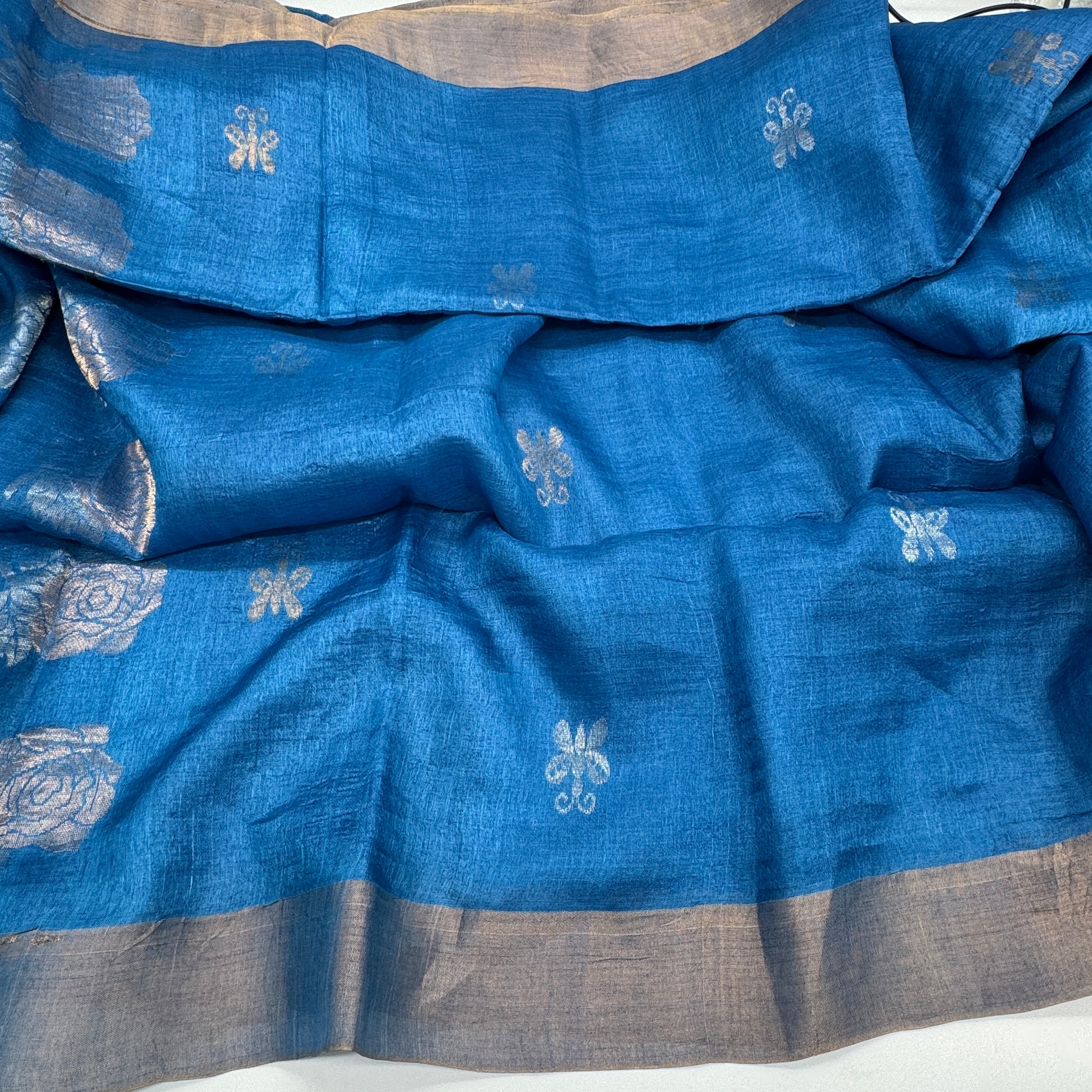 This is a stunning teal-blue tussar silk saree with a soft, luminous sheen that catches the light beautifully. The fabric has that signature tissue drape—lightweight, airy, and subtly crisp—making it perfect for festive and elegant occasions.