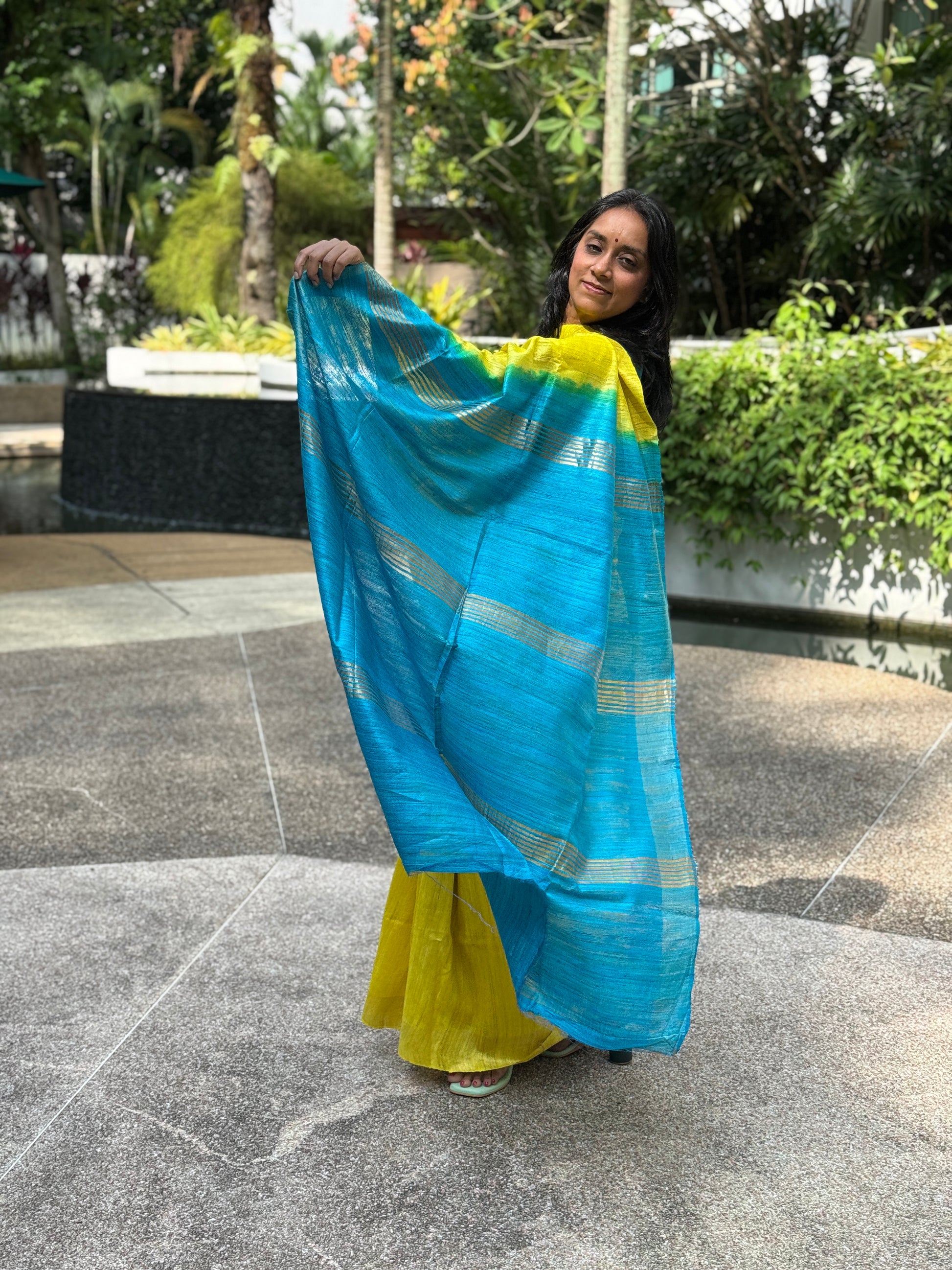 Sunlit Tide is a handwoven Ghicha silk saree that pairs a luminous yellow body with a cool, refreshing blue pallu. The contrast is playful yet composed—like sunlight meeting water.
