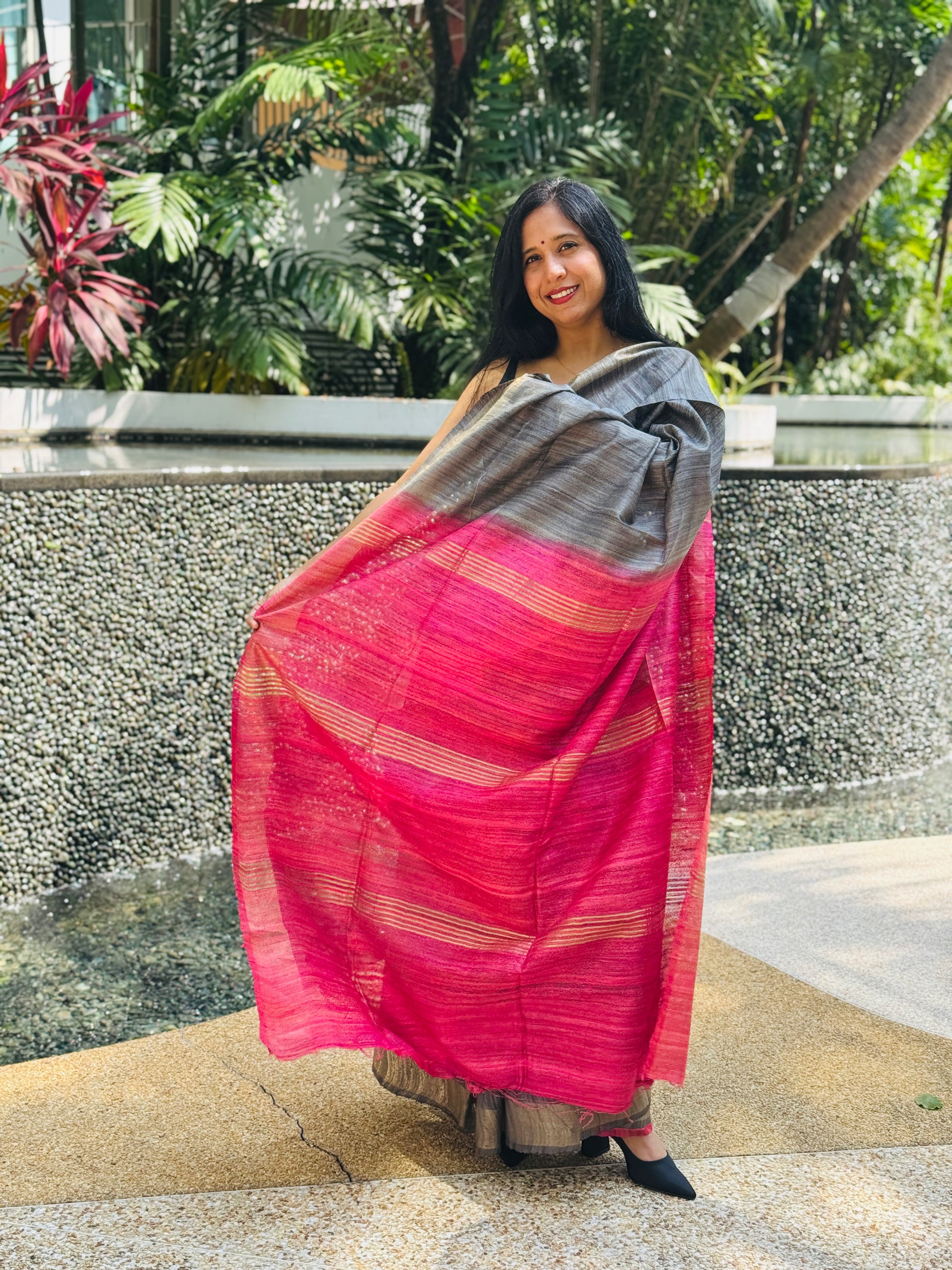 Crimson Pause is a handwoven Ghicha silk saree with a soft grey body and a vivid red pallu—minimal, modern, and deeply expressive. The muted grey feels calm and composed, while the red pallu arrives like a punctuation mark: confident, warm, unmistakable.