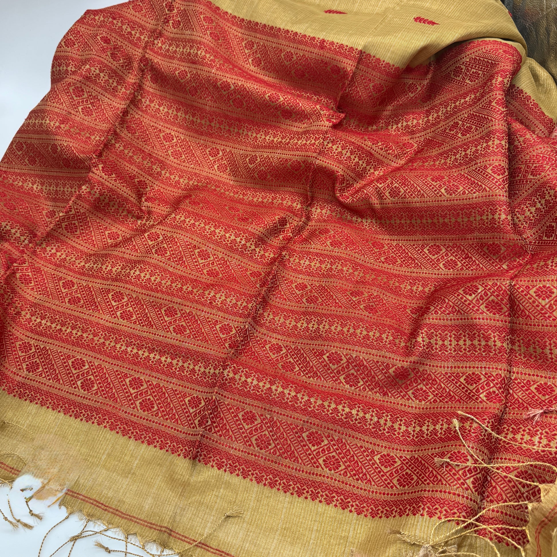 - Colour: Soft gold with deep red woven accents