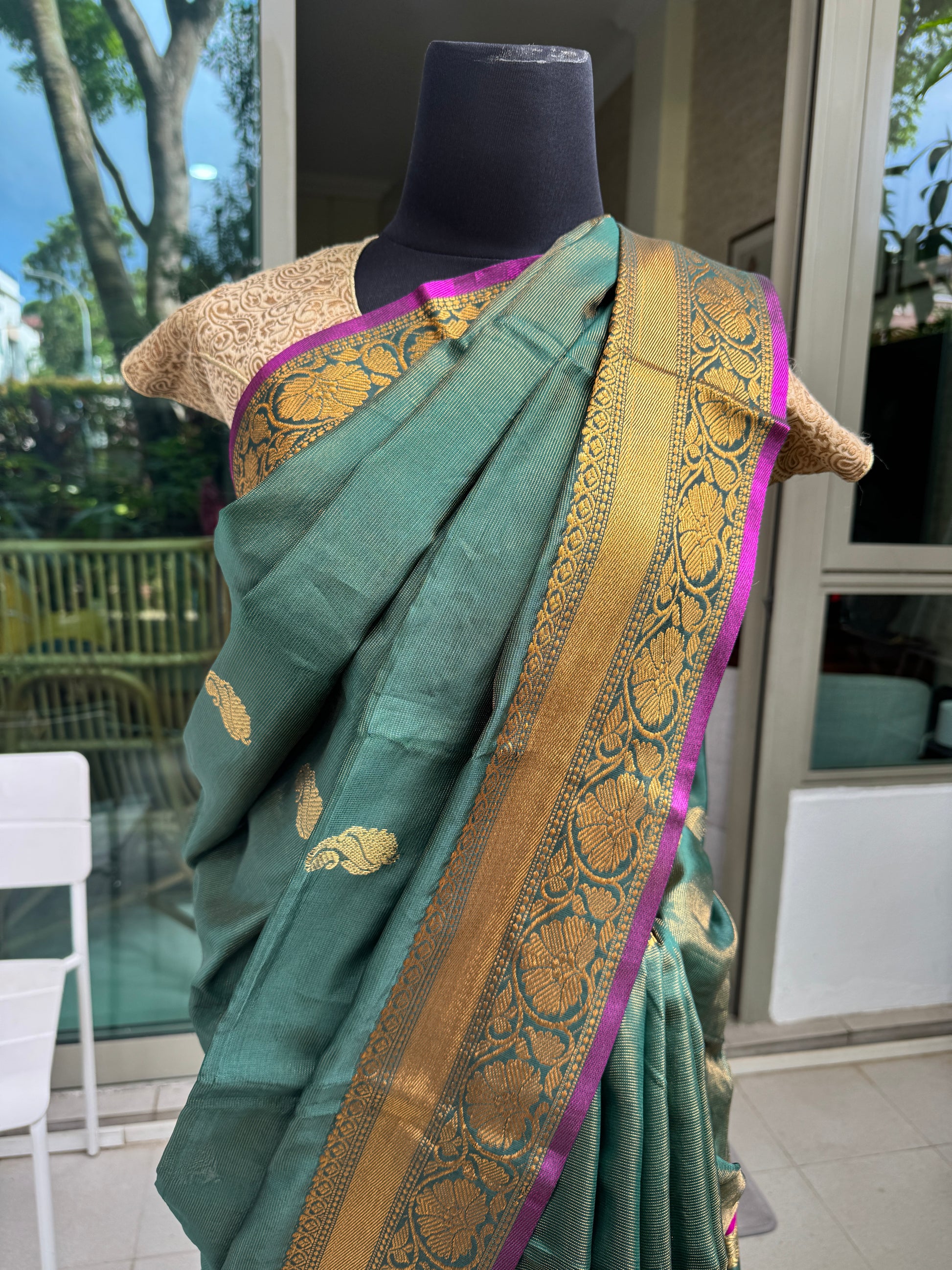 Harita is celebratory yet composed—a saree meant for temple visits, weddings, and meaningful occasions where tradition is worn with quiet confidence.