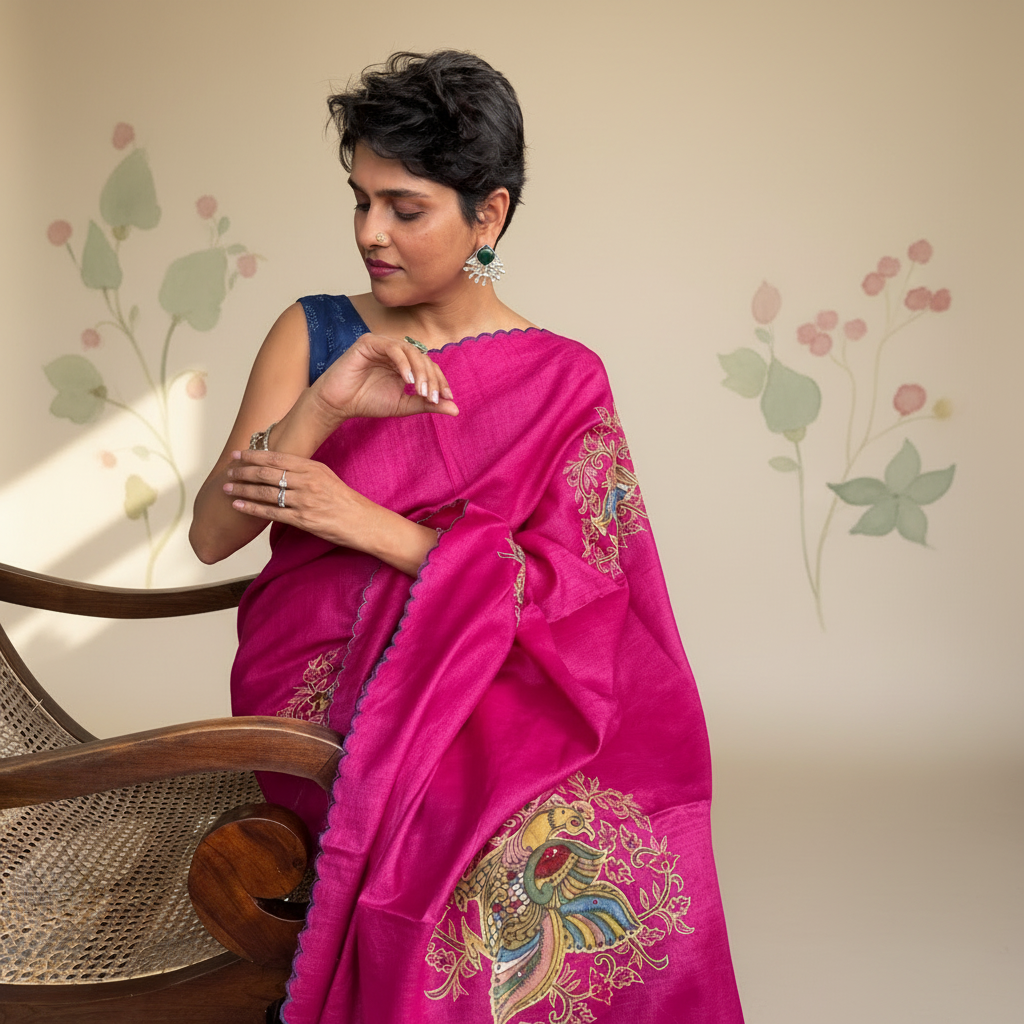 Duskrose: Pink Tussar Silk Saree with Kalamkari Appliqué