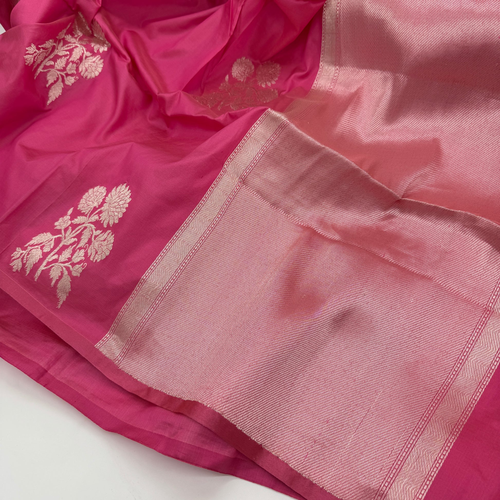 nshu—meaning ray of light—is a celebration of radiance and femininity. Handwoven in luminous Katan silk, this saree features delicate Banarasi floral motifs that shimmer gently against a vibrant rose-pink base. The borderless weave adds a modern touch to its timeless Banarasi charm, making Anshu the perfect blend of tradition and contemporary elegance.