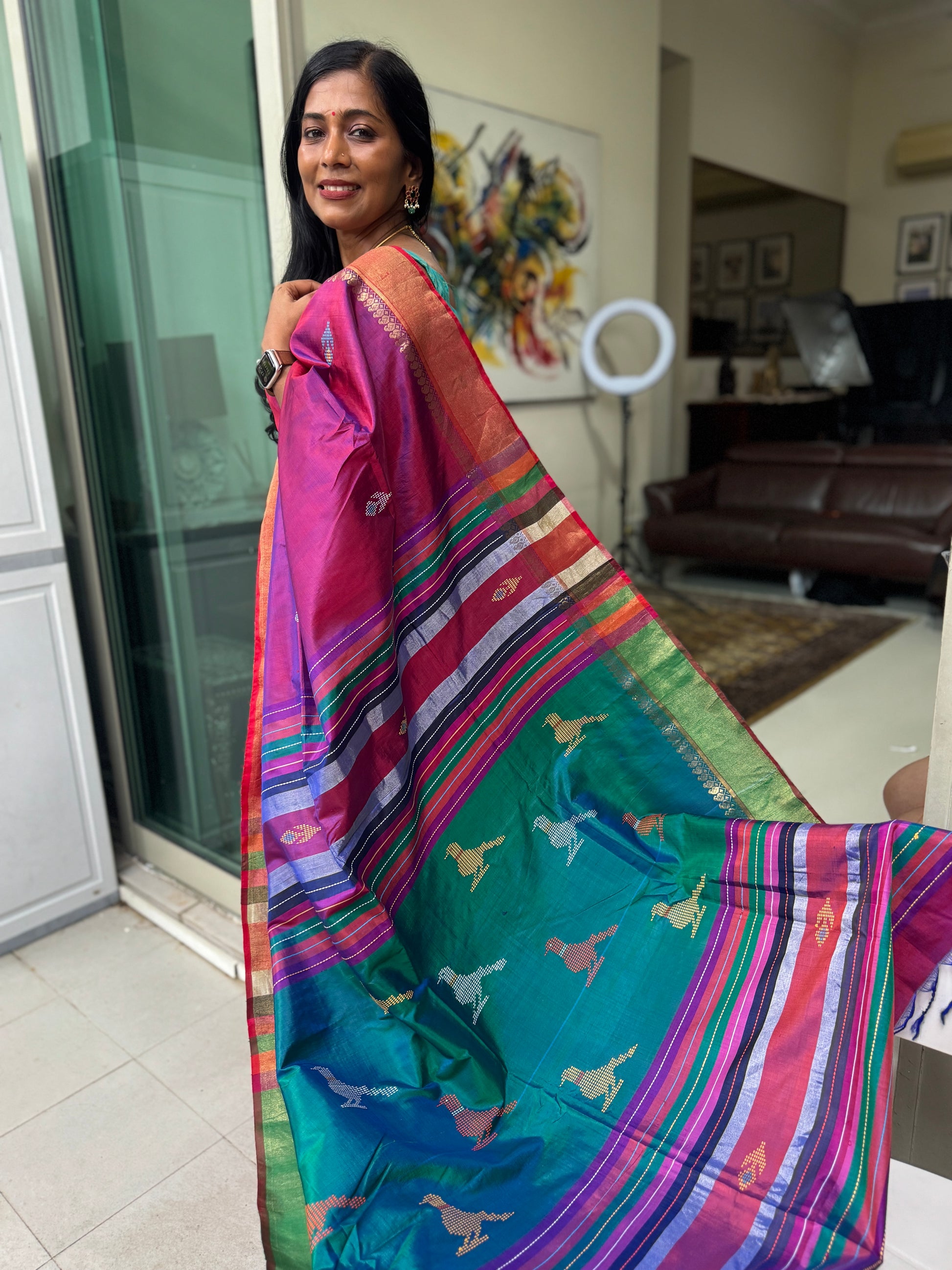 The rich purple base is brought alive with delicately pixelated bird motifs, meticulously woven into the fabric rather than printed—each motif emerging from the loom with quiet artistry. Despite the intricate detailing, the saree remains remarkably lightweight, with a natural silken lustre that catches the light beautifully and drapes effortlessly on the body.