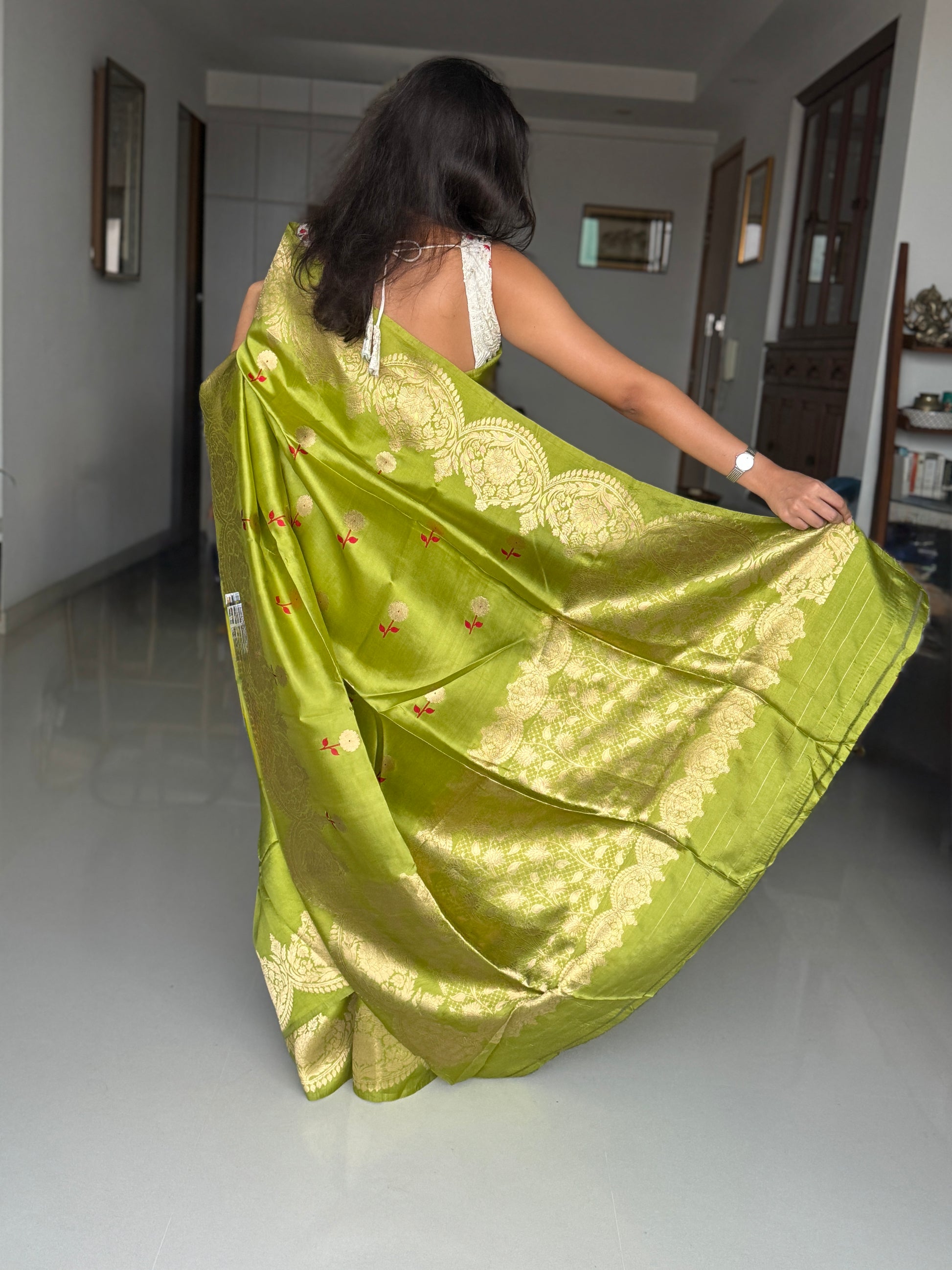 A refreshing take on Banarasi heritage, Aranya is a contemporary green Katan silk saree designed for women who love tradition—but wear it their own way.