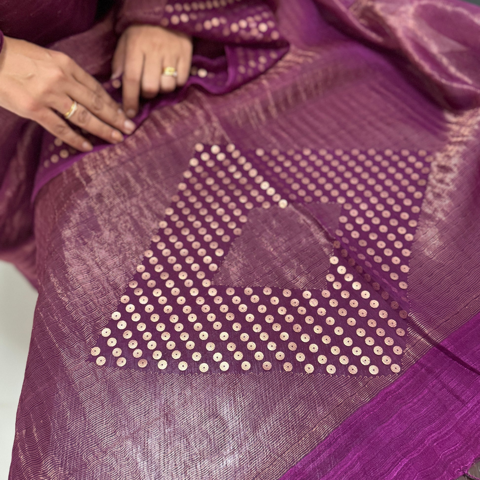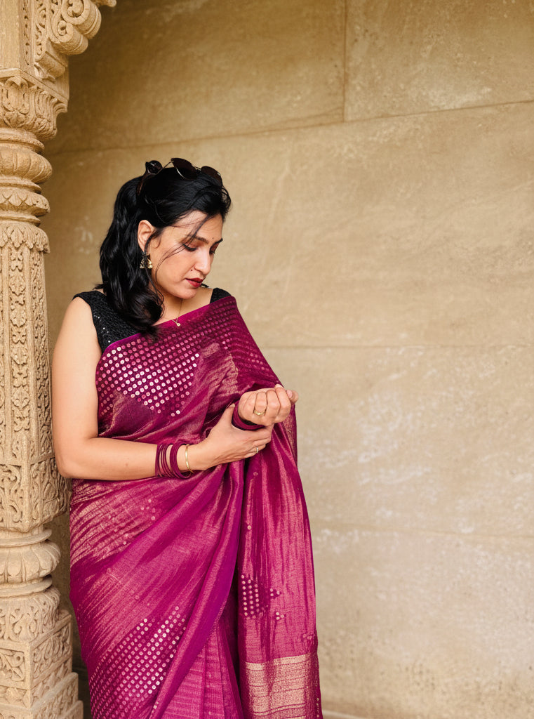 Lavanya—meaning grace and dignity—is a celebration of understated glamour. Woven in luminous crushed tissue fabric, this saree catches the light in the most enchanting way. The surface glistens softly with interwoven sequins, creating a subtle shimmer that feels regal yet effortless. The deep plum-magenta hue adds richness, making Lavanya a timeless piece for festive evenings and celebrations that call for quiet sophistication.