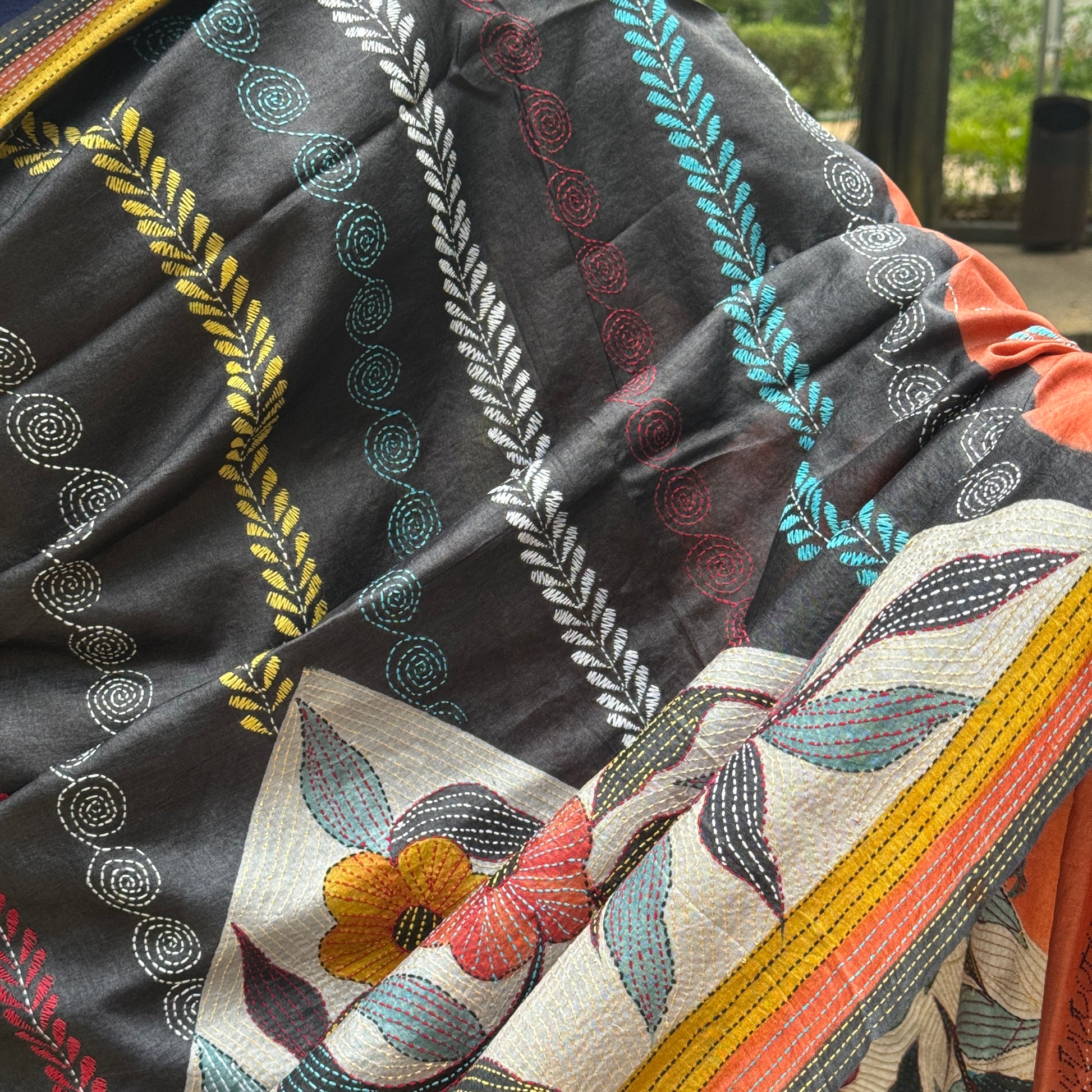 Like the first sunlight after rain, Neharika glows with warmth and allure. Woven from pure tussar silk, this saree brings together hand block-printed florals and exquisite Kantha embroidery — a marriage of colour and craft. The deep rust pallu contrasts beautifully with the hand-embroidered black body, while the floral border in vibrant hues adds an unmistakable artistic charm.