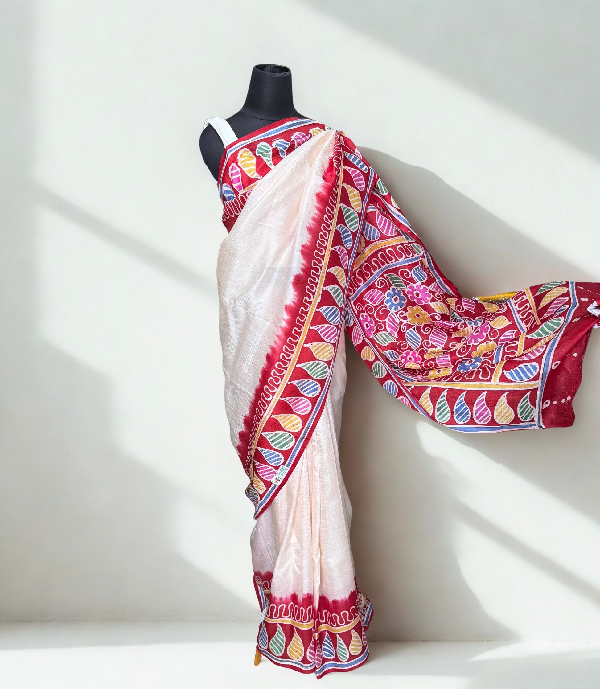 Step into timeless elegance with this handcrafted Batik Tussar silk saree, where tradition meets vibrant artistry. The serene white tussar base is elevated with a striking red border, detailed with hand-drawn batik motifs in a medley of colors—each leaf and floral pattern narrating the story of skilled artisanship.