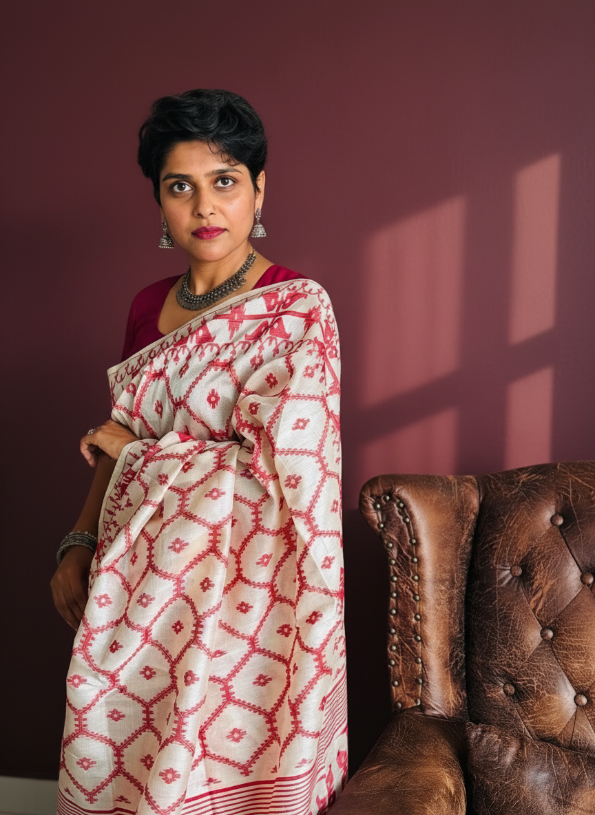Woven in pure Tussar silk, this white saree comes alive with rhythmic red motifs—geometric, grounded, and unmistakably confident. The natural texture of Tussar lends it a raw elegance, while the red borders and patterns add warmth and quiet drama.
